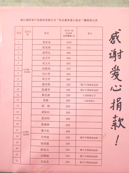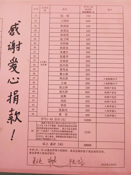 為繼續(xù)做好新一年度愛心基金工作,公司黨總支從2月5日-12日期間開展了2018年度公司“黨員慈善愛心基金”捐贈工作,得到了全體黨員、入黨積極分子、黨員經(jīng)營戶和入黨申請人的熱烈響應,黨總支屠書記率先獻愛心,共有45位同志踴躍捐款共計16890元,連同開發(fā)區(qū)下拔的結(jié)對困難戶慰問資金2160元,總計19050元匯入公司“黨員慈善愛心基金”池,開展2018年度向困難戶等扶弱濟困慰問工作。
