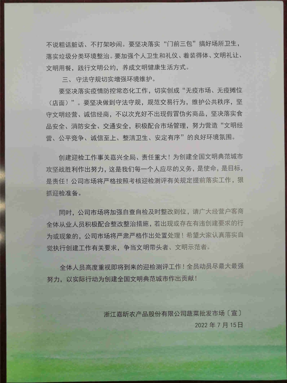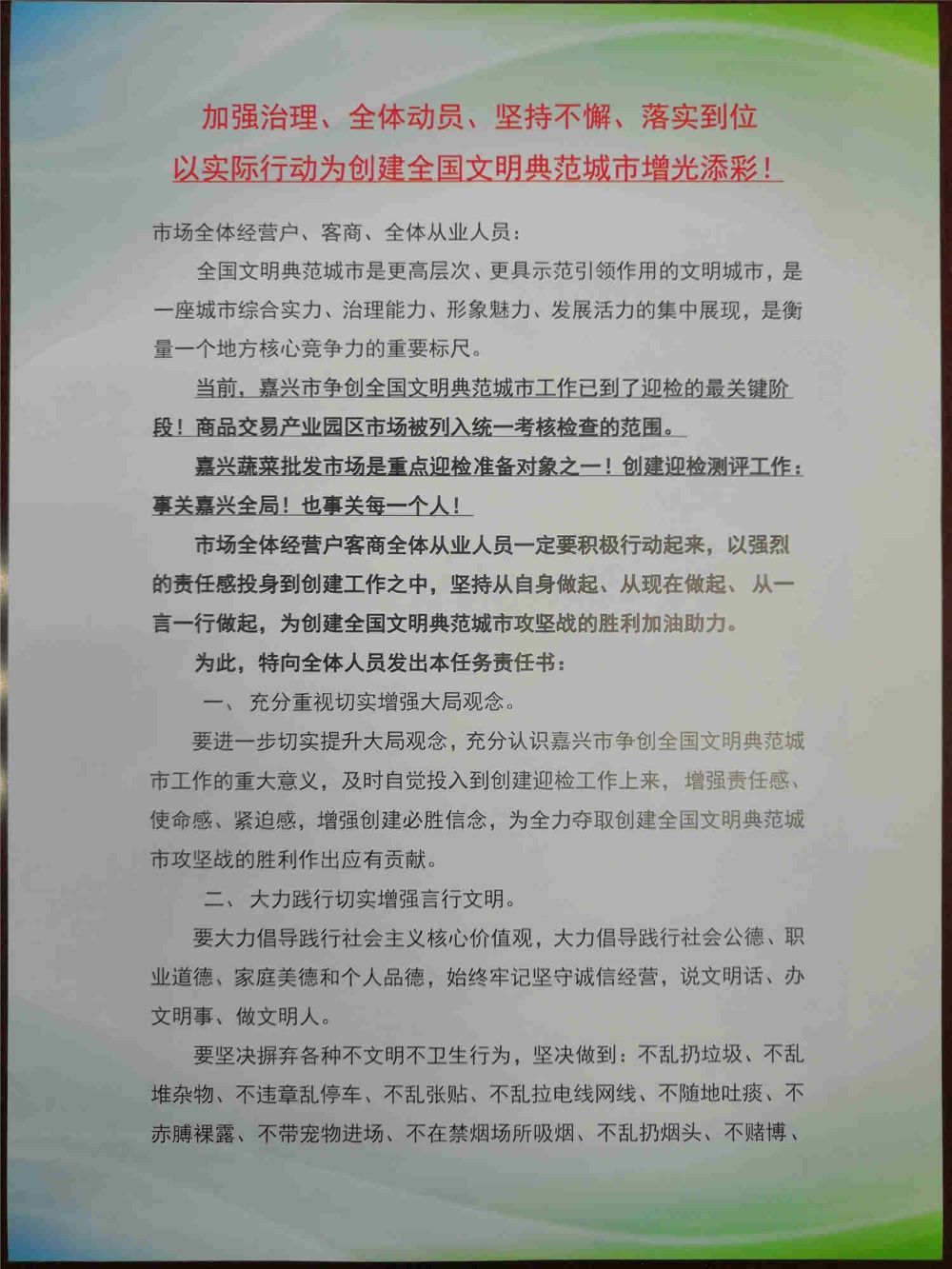 當(dāng)前,嘉興市爭(zhēng)創(chuàng)全國(guó)文明典范城市工作已到了最關(guān)鍵的迎檢階段,創(chuàng)建迎檢測(cè)評(píng)工作事關(guān)全局,也事關(guān)著每一個(gè)人。公司市場(chǎng)高度重視創(chuàng)建工作,加強(qiáng)治理、全體動(dòng)員,攻堅(jiān)克難,按照上級(jí)要求、對(duì)照測(cè)評(píng)標(biāo)準(zhǔn),狠抓思想發(fā)動(dòng)、狠抓弱薄整治、狠抓交易秩序、狠抓現(xiàn)場(chǎng)面貌,以久久為功的決心和行動(dòng)全力為創(chuàng)建加分而努力。