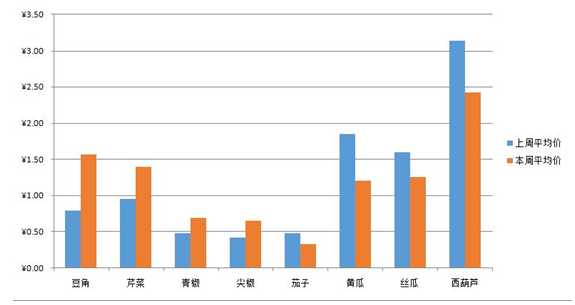 另:茄子環(huán)比下降32.35%、黃瓜環(huán)比下降34.62%、絲瓜環(huán)比下降21.43%、西葫蘆環(huán)比下降22.74%,價(jià)格大幅下降,原因:此類蔬菜正處于大量上市期,市場(chǎng)供應(yīng)充足,造成供大于求的局面,進(jìn)而造成價(jià)格下降,尤其茄子,上市比較集中,造成價(jià)格驟降。