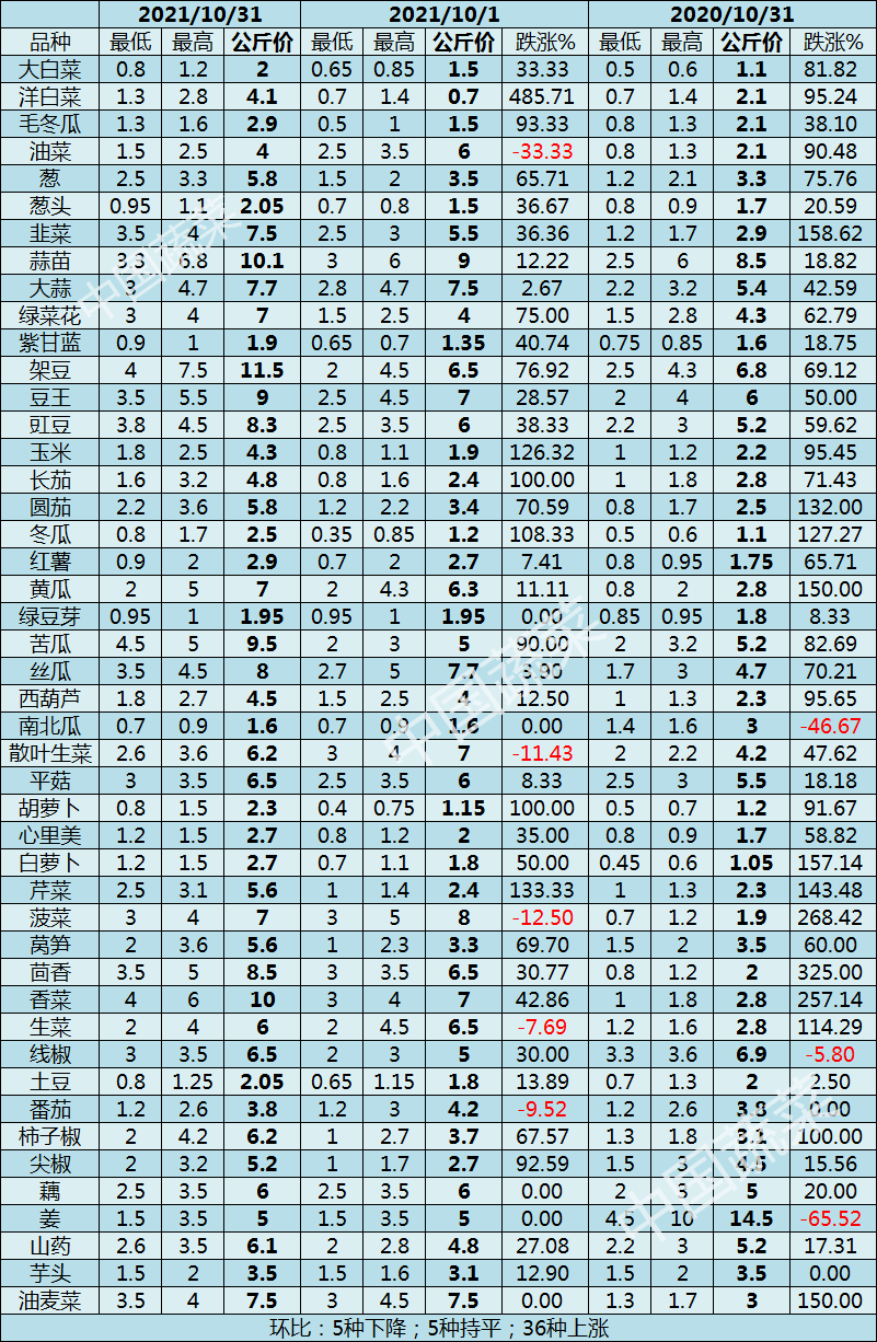 ▲2021年10月31日與10月1日及2020年10月31日常用蔬菜價(jià)格對(duì)比表(單位:元/公斤)